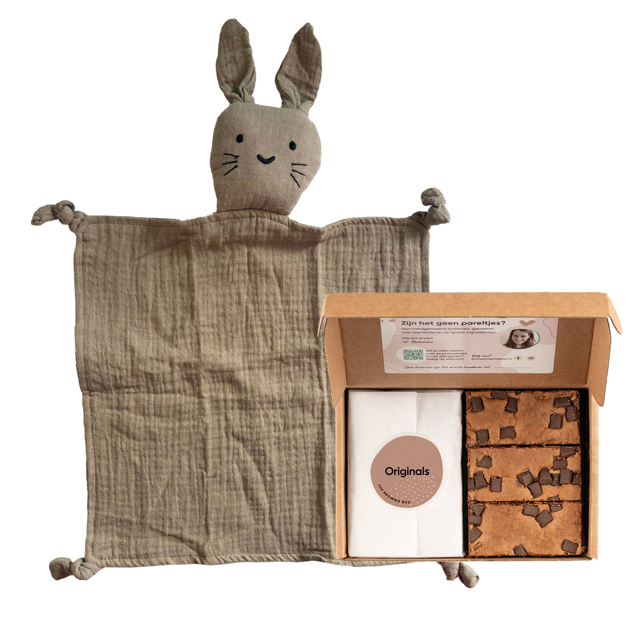 Een kraamcadeau waar je zéker punten mee scoort: onweerstaanbare verse brownies gecombineerd met een zacht, zandkleurig hydrofiel knuffelkonijntje.