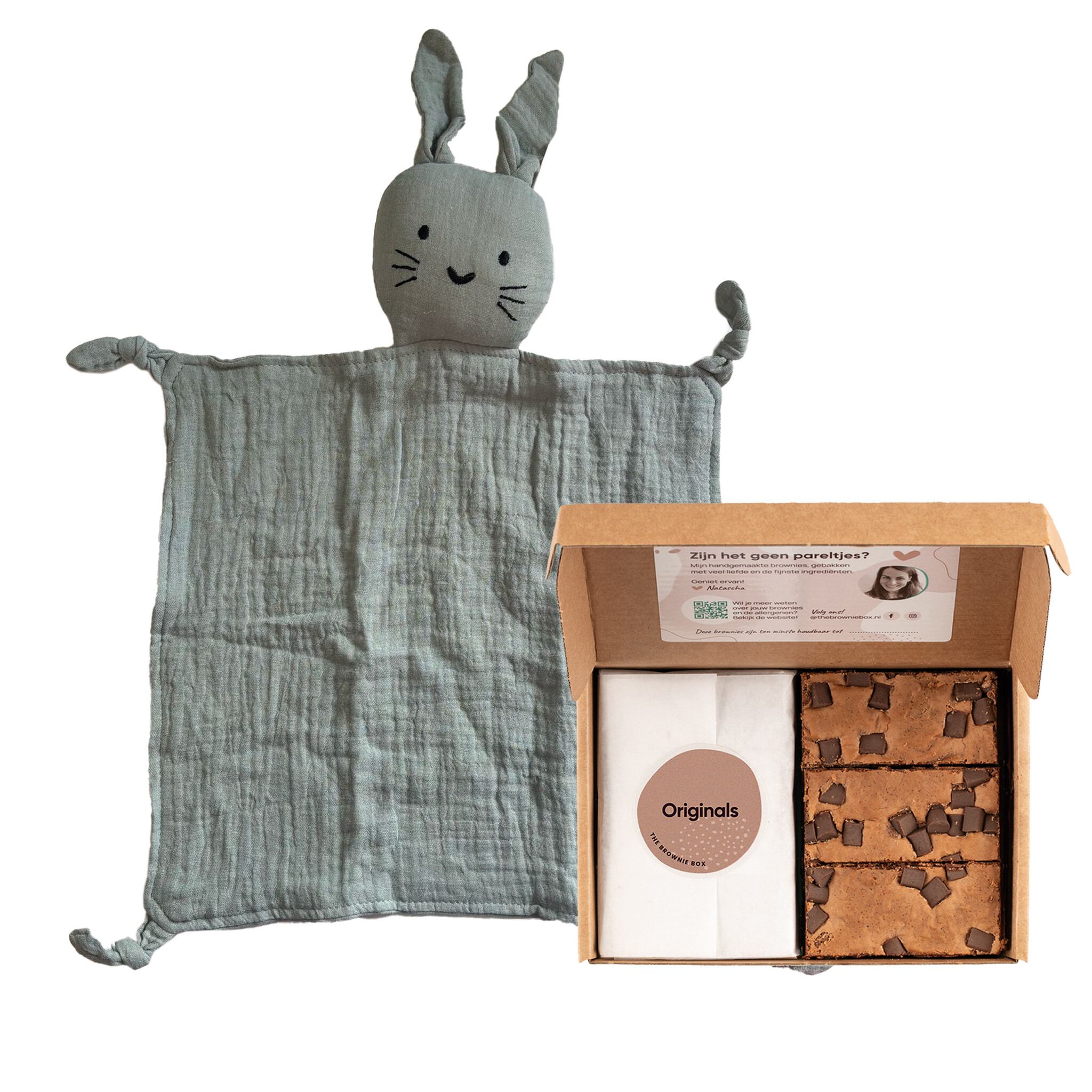 Een kraamcadeau waar je zéker punten mee scoort: onweerstaanbare verse brownies gecombineerd met een zacht, grijsblauw hydrofiel knuffelkonijntje.