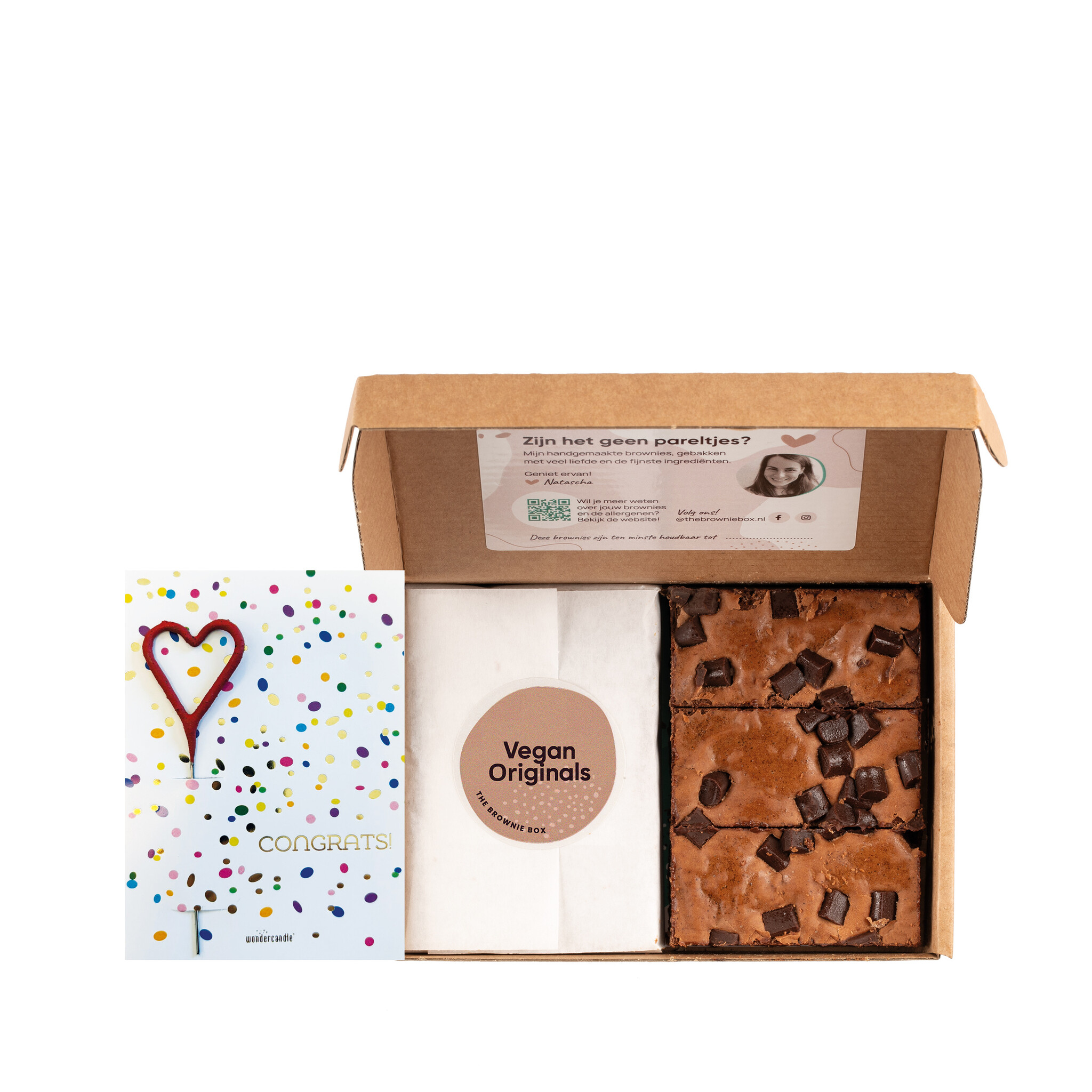 Vier elk moment met onze verse handgemaakte Vegan Brownies, met sprankelende wondercard met tekst 'Congrats' en een aansteekbaar hartje. Of het nu een verjaardag, halen van een rijbewijs of examen of zelfs een spontane verrassing is, dit persoonlijke brievenbuscadeau maakt van elk moment iets bijzonders.